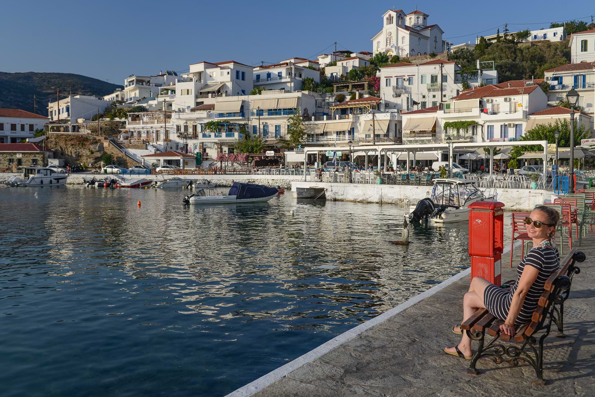 Im Küstenort Batsi auf der griechischen Insel Andros: Julia sitzt auf einer Bank am Meer und genießt den Blick auf die Häuser und den Hafen